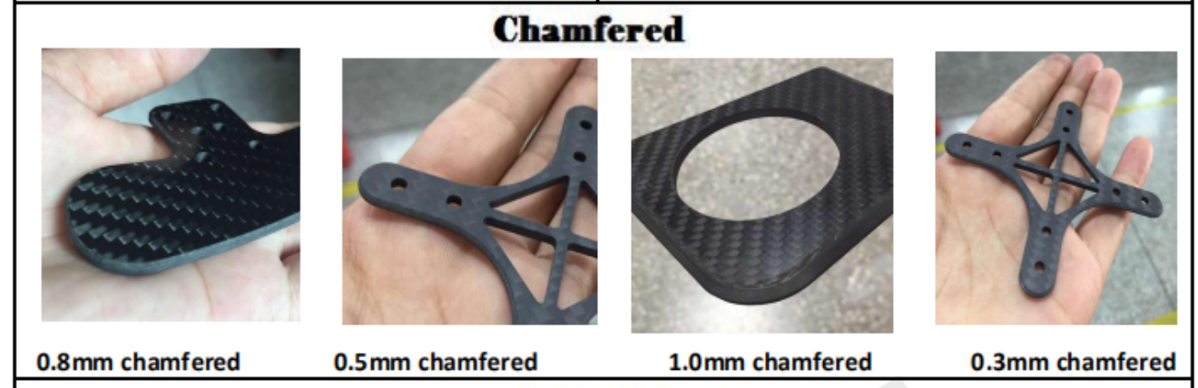 If you want to make some chamfer on the carbon fiber parts check below chamfer , we can do 0.3mm ,0.5mm ,0.8mm ,1mm 2mm chanfer , Thiner below 3mm carbon fiber plate recommend just 0.3 or 0.5mm , thicker over 4mm can me 0.8mm or more , if you are not sure how deep need to make chamfer feel free to talk to us or email info@xccarbonfiber.com